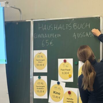 Die zentralen Themen, die angesprochen wurden, waren: Was ist der Euro? Der Weg des Geldes (vom Tauschhandel zum Euro?), Wie führe ich ein Haushaltsbuch? Was sind fixe und variable Kosten? Im dritten Teil der Workshop-Runde ging es um das Thema Preissteigerung. Was kostete ein Liter Milch vor 2 Jahren und jetzt? Die SchülerInnen waren mit Interesse bis Begeisterung dabei. Danke an das Team von Finanzfit für euer Kommen!